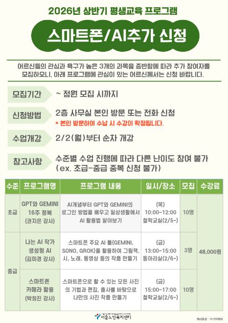 [평생교육팀] 정보화교육 정규(스마트폰/AI) 추가 신청자 모집