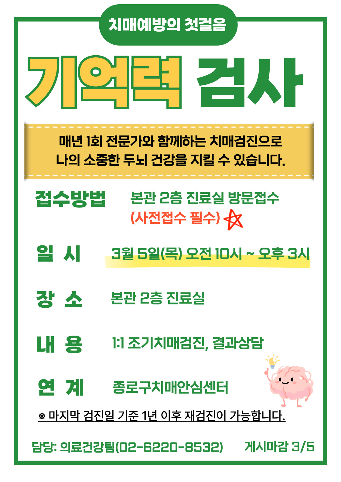 [의료건강팀] <3월 기억력 검사> 접수안내