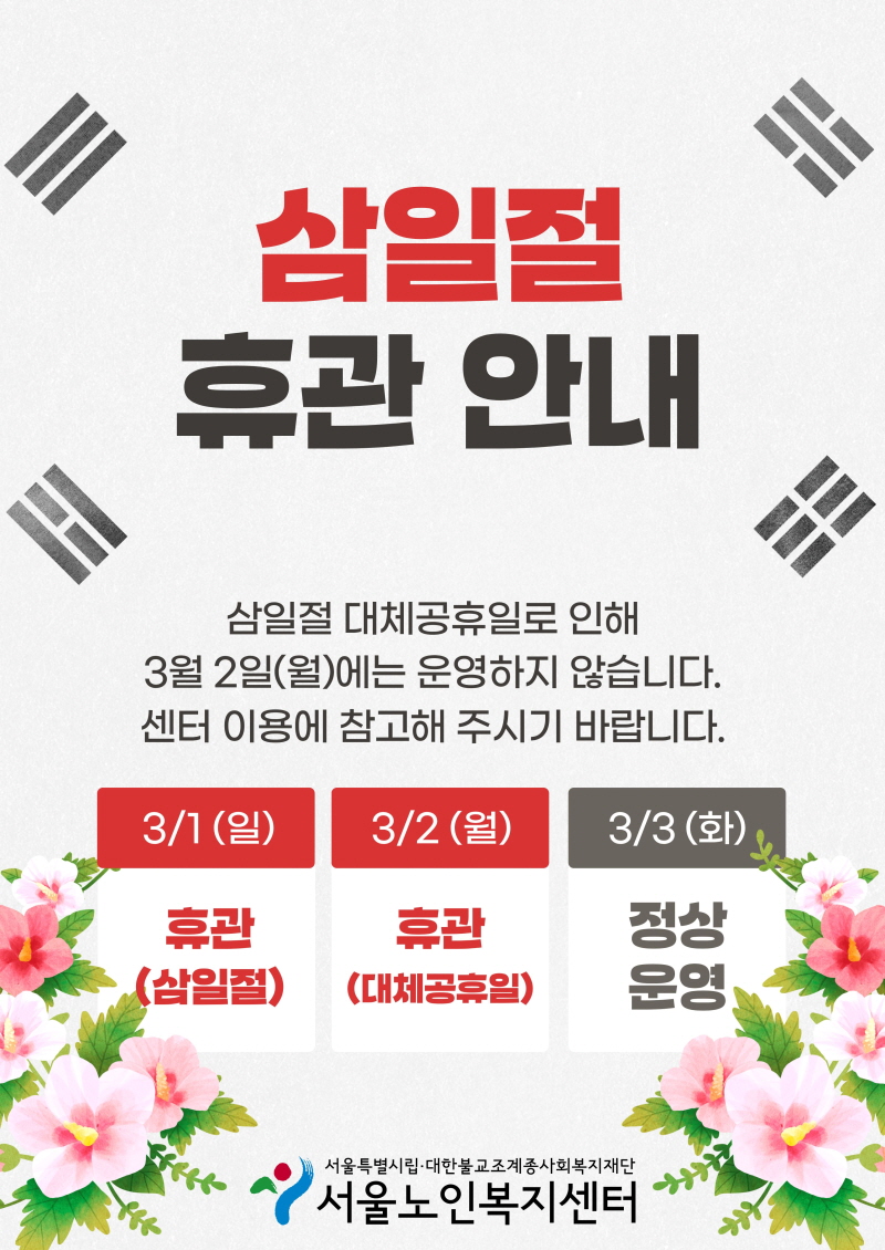 삼일절 대체공휴일로 인해 3월 2일(월)에는 운영하지 않습니다.