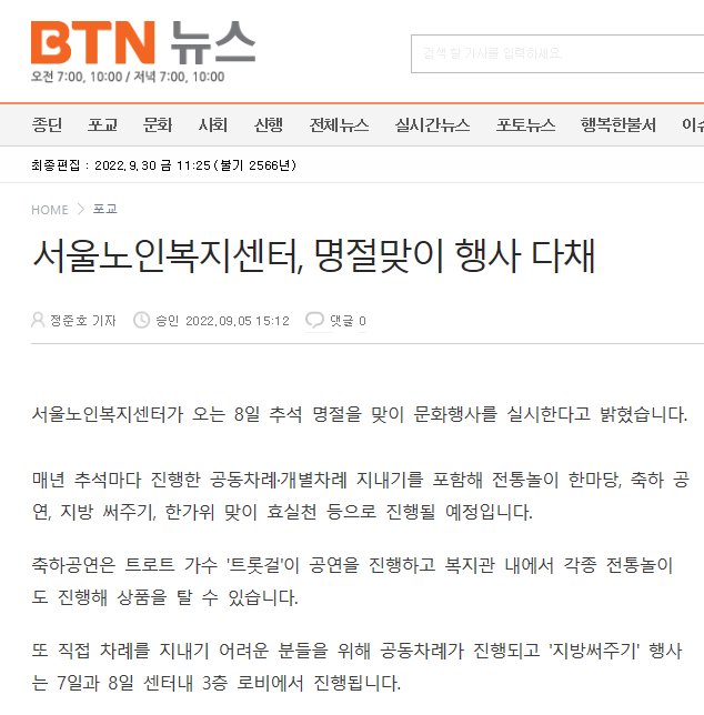 [2022.09.05_BTN NEWS] 서울노인복지센터, 명절맞이 행사 다채