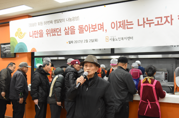임승만 어르신은 또한 인사말씀을 하시면서 “2,000명 어르신과 함께 맛있는 식사를 하는 이번 생일이 어느 때보다 특별한 잔치가 되었고, 센터에서 이런 자리를 만들어줘서 고맙다”고 말씀하셨습니다.